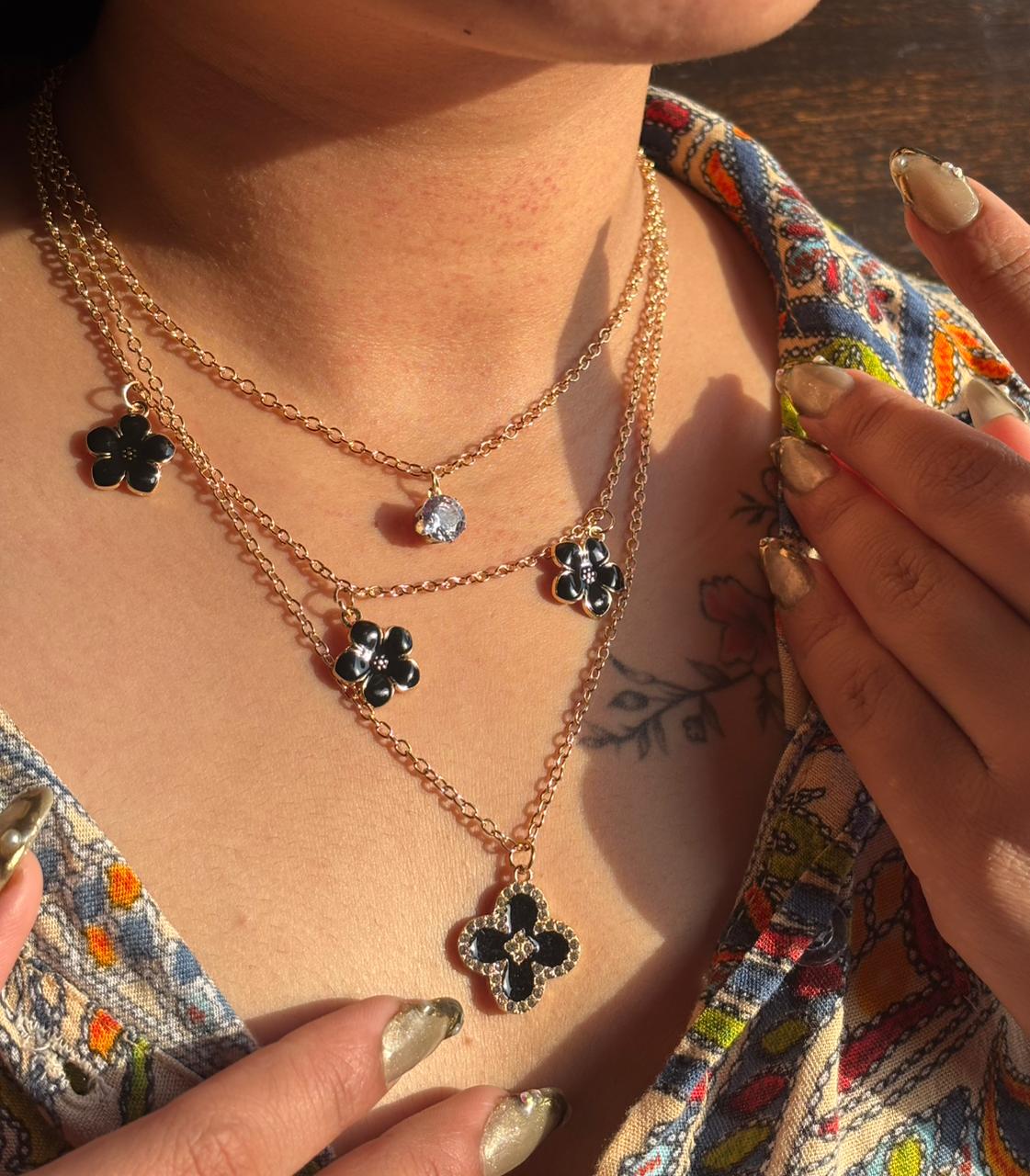 Golden Black Floral Layered Pendant Necklace